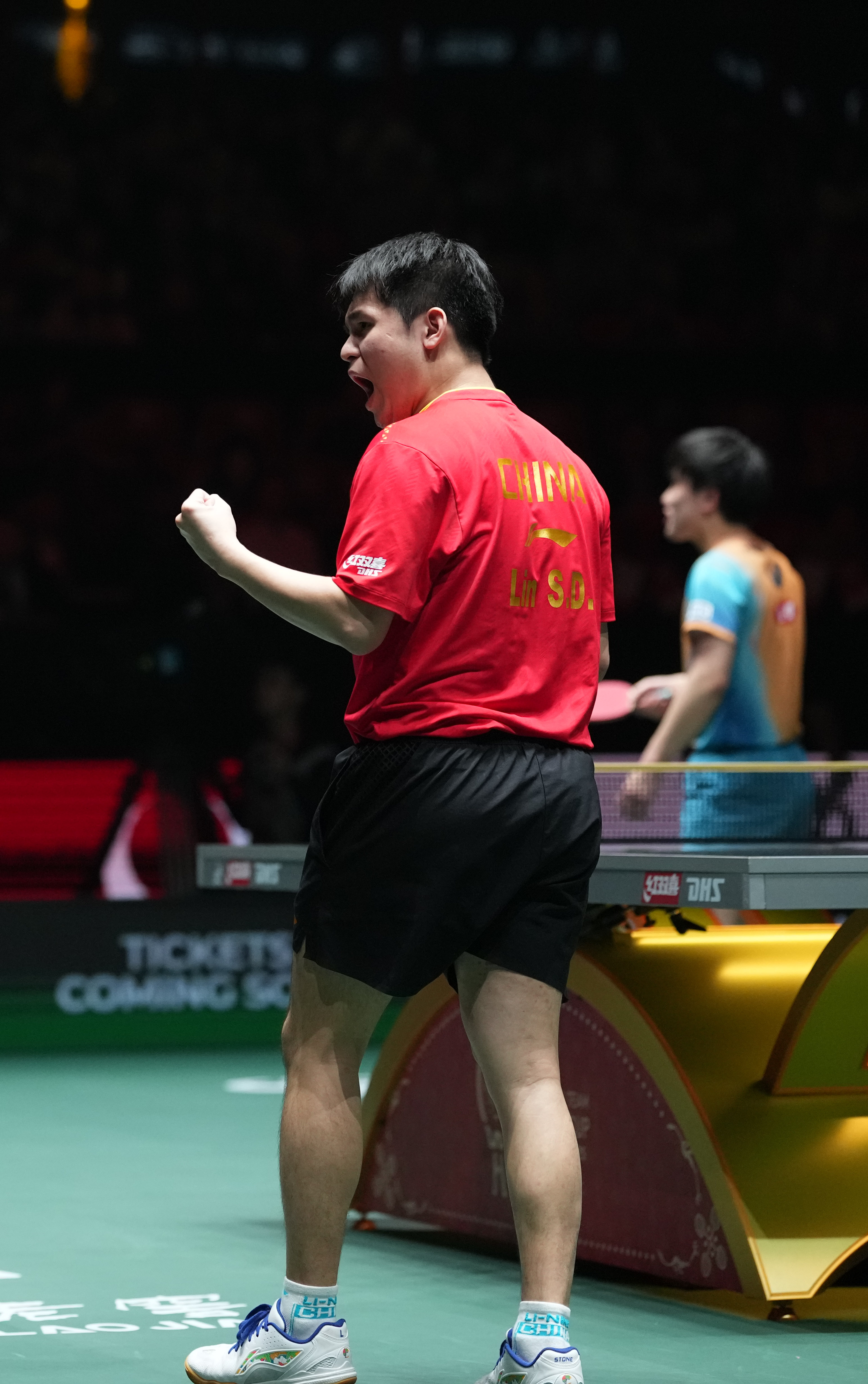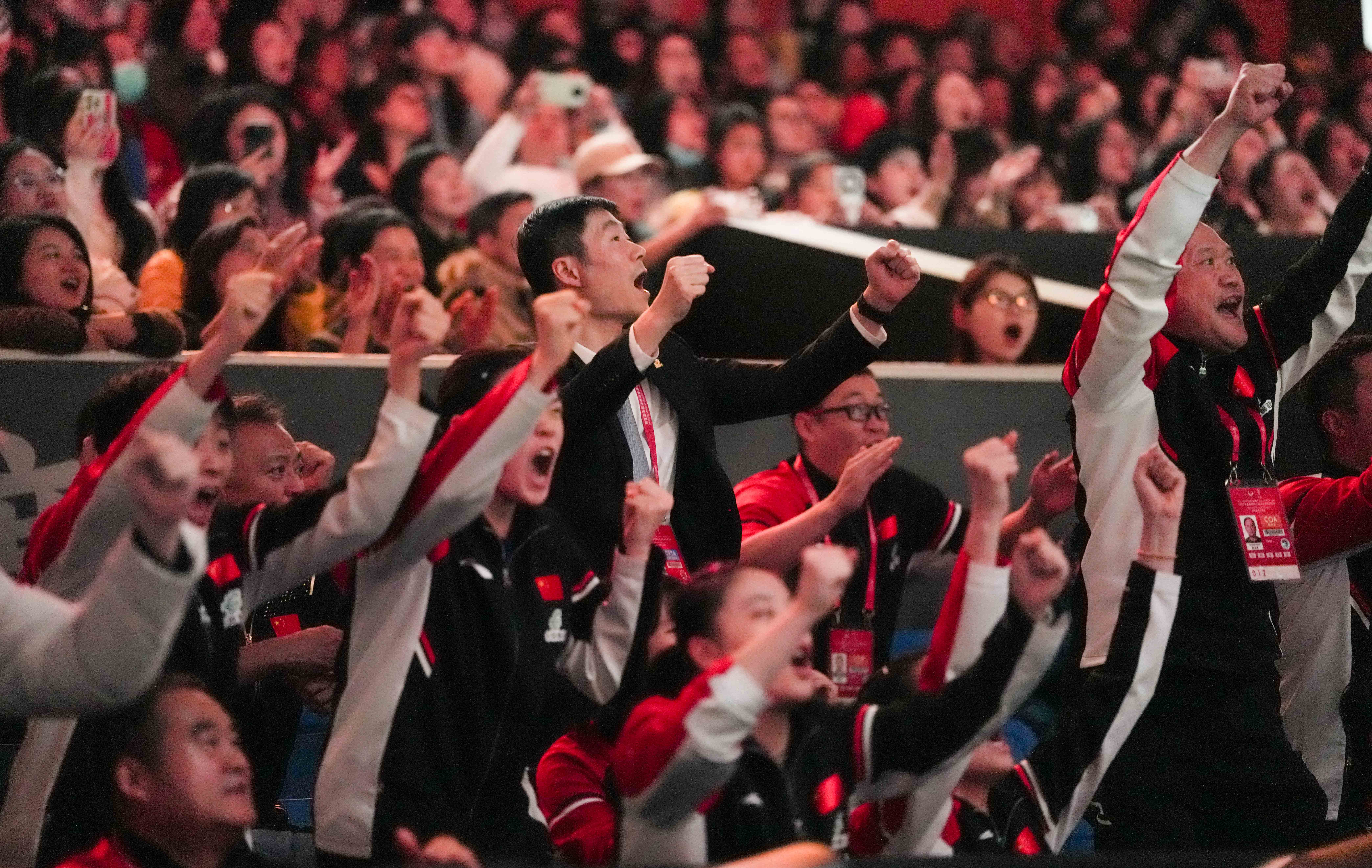 当中国队获胜后,一直在看台上观赛的中国乒乓球协会主席王励勤来到中国队比赛席,与队员和教练握手祝贺,他称赞林诗栋,“开始没发挥好,后来找到感觉啦,祝贺!”